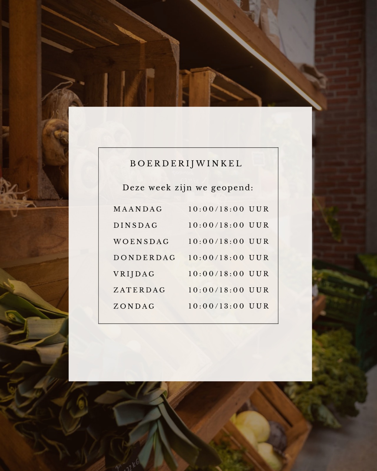 Neem de tijd om rond te kijken in onze boerderijwinkel en laat je verrassen door de versheid en kwaliteit. Hiernaast vind je meer informatie over onze openingstijden. We kijken ernaar uit je te verwelkomen!