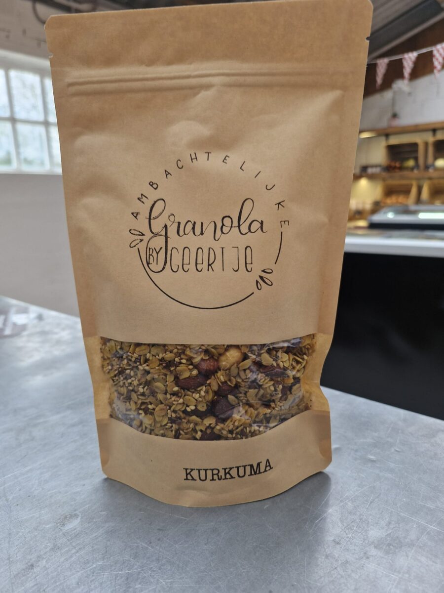 Ambachtelijk bereide granola met de unieke smaak van kurkuma. De inhoud is zo’n 300 gram.